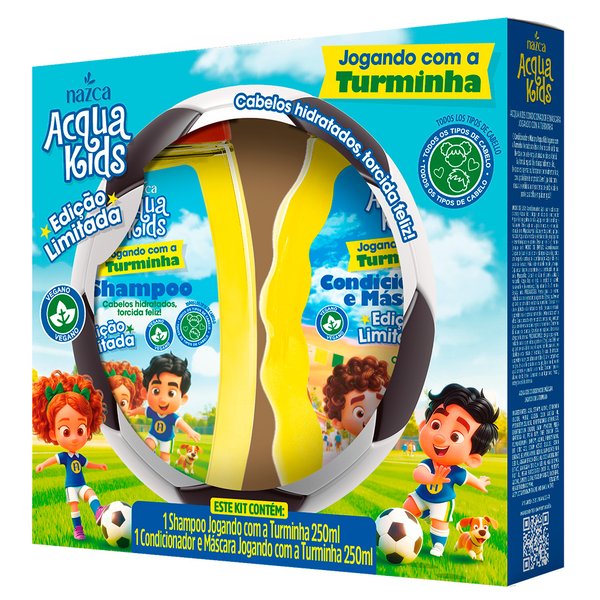Com a energia contagiante do futebol, a hora do banho vira o campeonato mais divertido do dia. Prepare-se para a torcida: com a linha ACQUA KIDS Jogando com a Turminha, o shampoo, condicionador, creme de pentear e o gel de glitter é um gol de placa contra o ressecamento e o embaraço. Agora é só vestir a camisa verde e amarela, caprichar no penteado e comemorar como um verdadeiro campeão: banho tomado, cabelinho hidratado e torcida feliz!