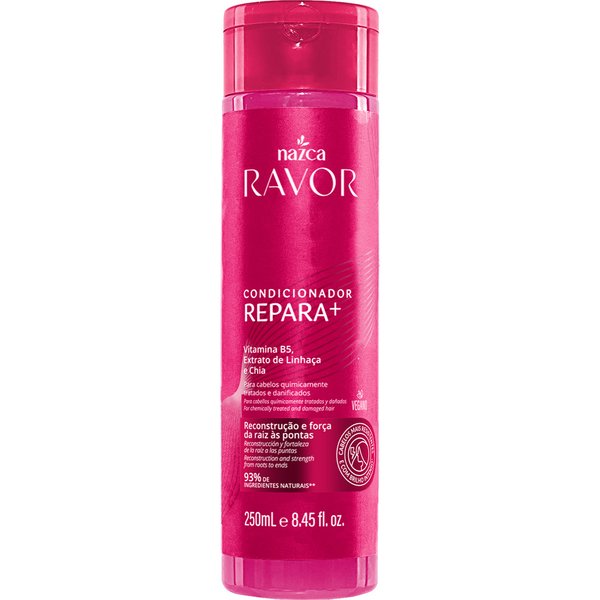 O condicionador Ravor Repara+ foi especialmente desenvolvido com ativos que proporcionam reparação para os cabelos. Sua fórmula contém Vitamina B5, Extrato de linhaça e chia que fortalecem e reparam os cabelos danificados, promovendo mais resistência e saúde aos fios. Além de auxiliar na reconstrução e condicionamento capilar, protege os cabelos contra danos causados por processos químicos, garantindo um cabelo saudável e brilhoso.